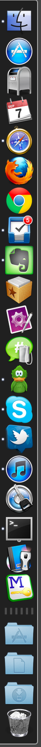 This is the current state of my Dock while working this evening. (Yeah, I know—your v-scroll. Ah, well.)
